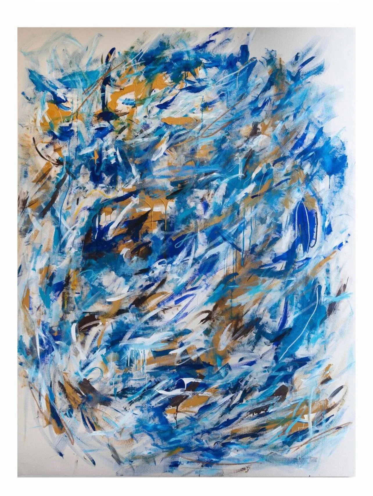 ๐&๐ contains hundreds of single individualized bold gestures capturing my dance up + down my step ladder, while maintaining a unified + cohesive painting. Each stroke joins the circular flow, making the work whole + complete. Using one of my favorite color combos of brown + blue providing a soothing contrast upon the natural negative space of the tan canvas. โฃ