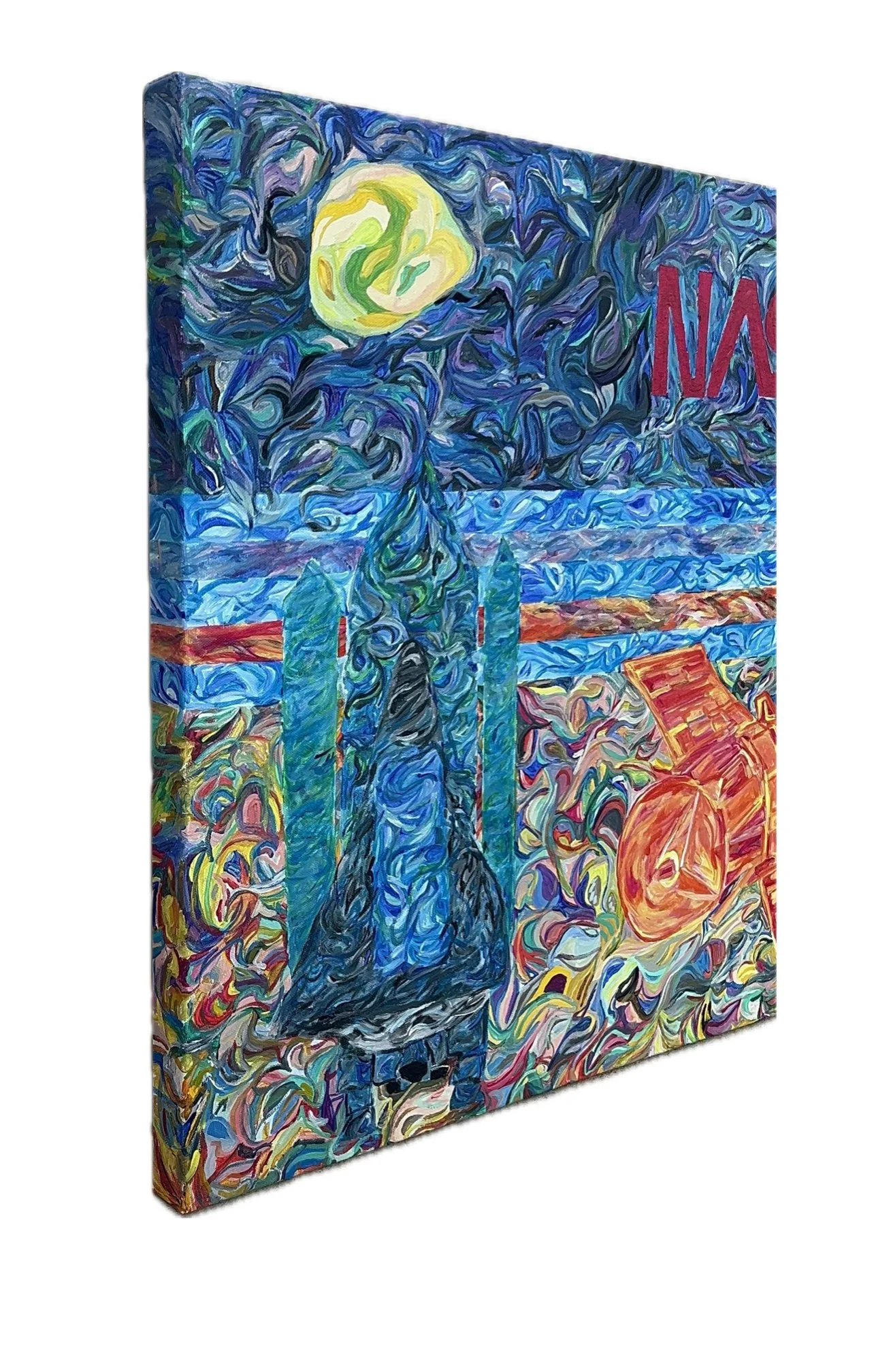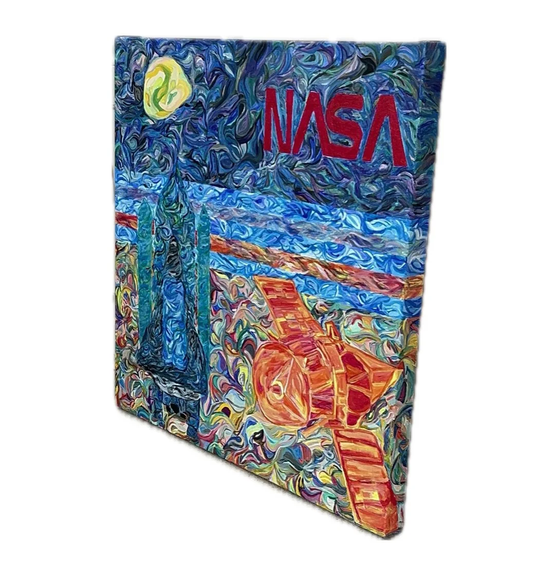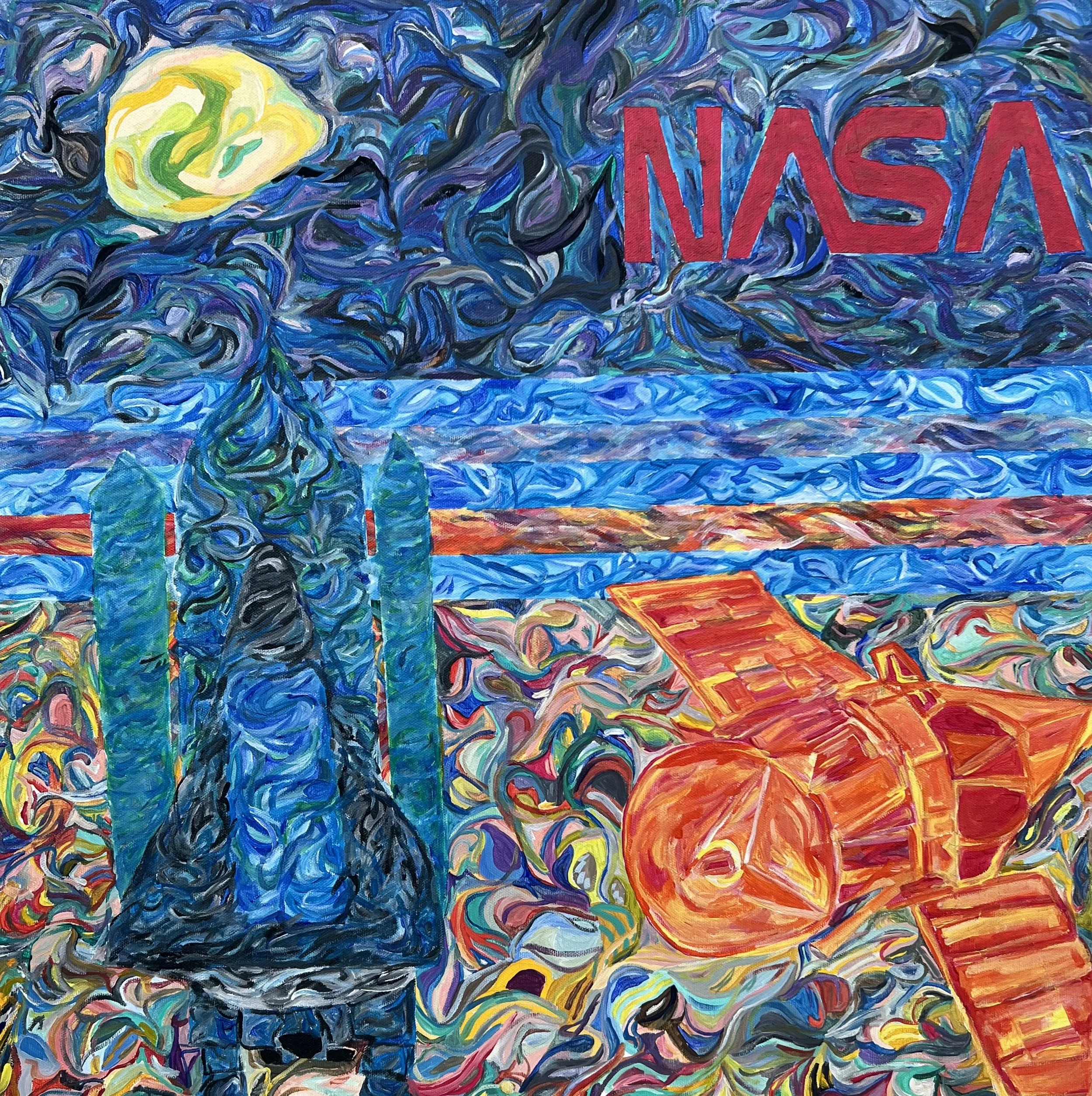 I added images of the NASA logo, space photography of the moon and atmosphere, rocket and satellite in the painting. These images are intertwined within and throughout the entire painting; the images and abstractions unified yet, identifiable only by the contrast of colors. They almost blend in with the flow of the entire painting, emerging from and descending back into the background. There’s a movement and singular essence of all the elements in the painting. It appears like a flow of energy. Waves. Currents of color moving throughout the work. This energy embodies the universe, representing the interconnectedness of all beings and things.