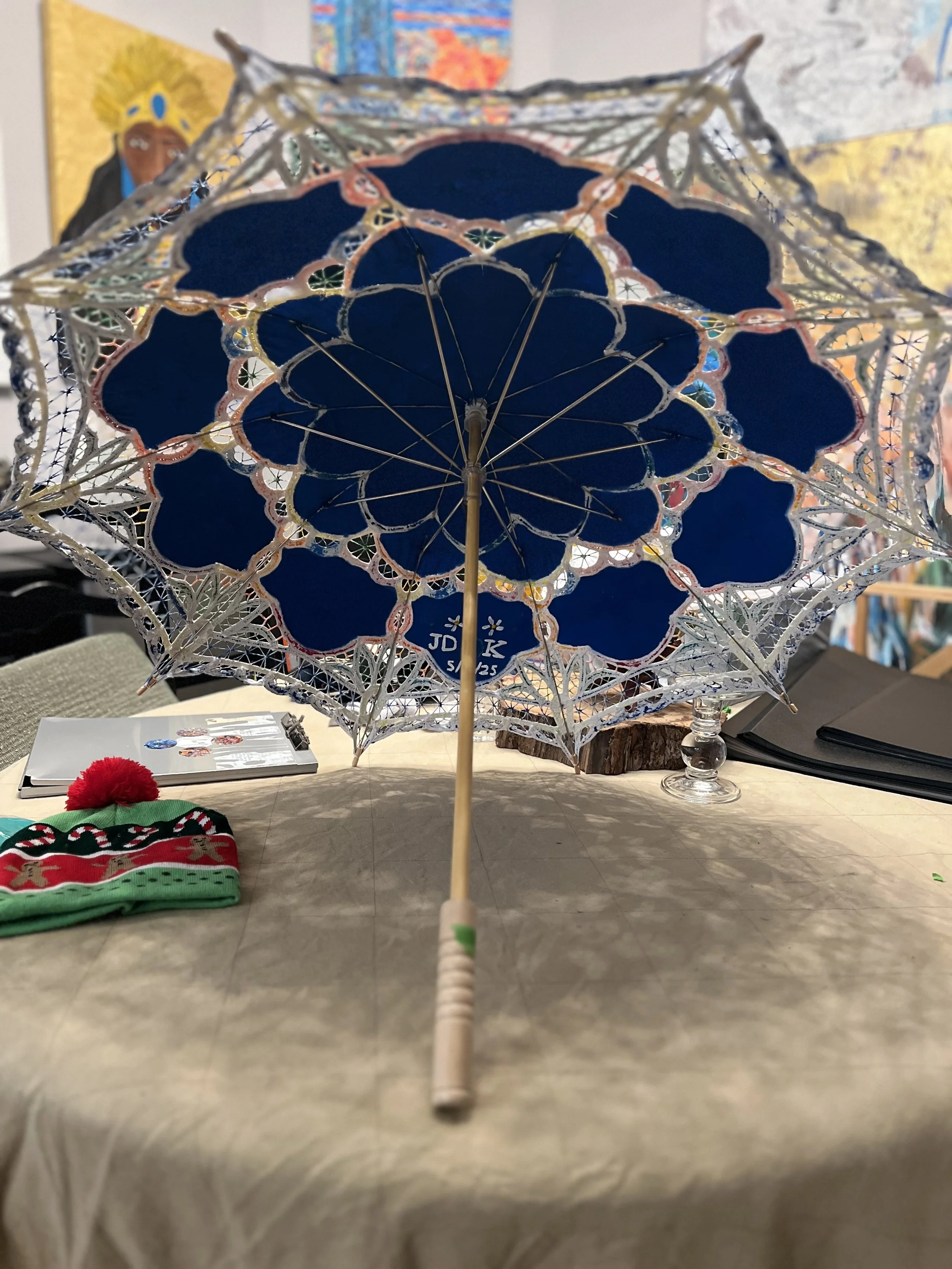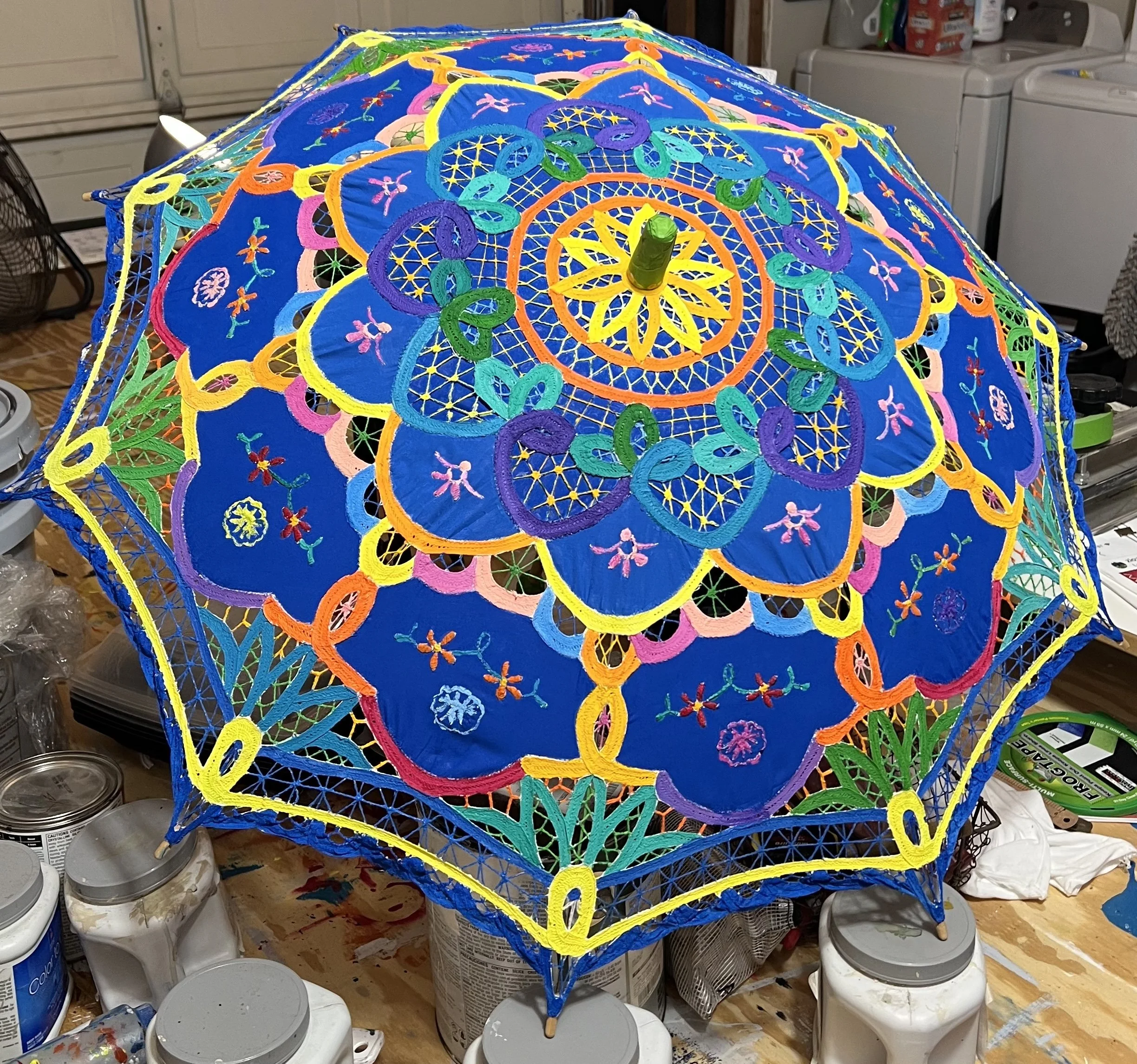Upon examining the umbrella, I realized that I did not need to reinvent the wheel by creating a brand new design. I could embrace the intricate design innate within the umbrella and allow the painted colors to accentuate the craftsmanship of the umbrella.