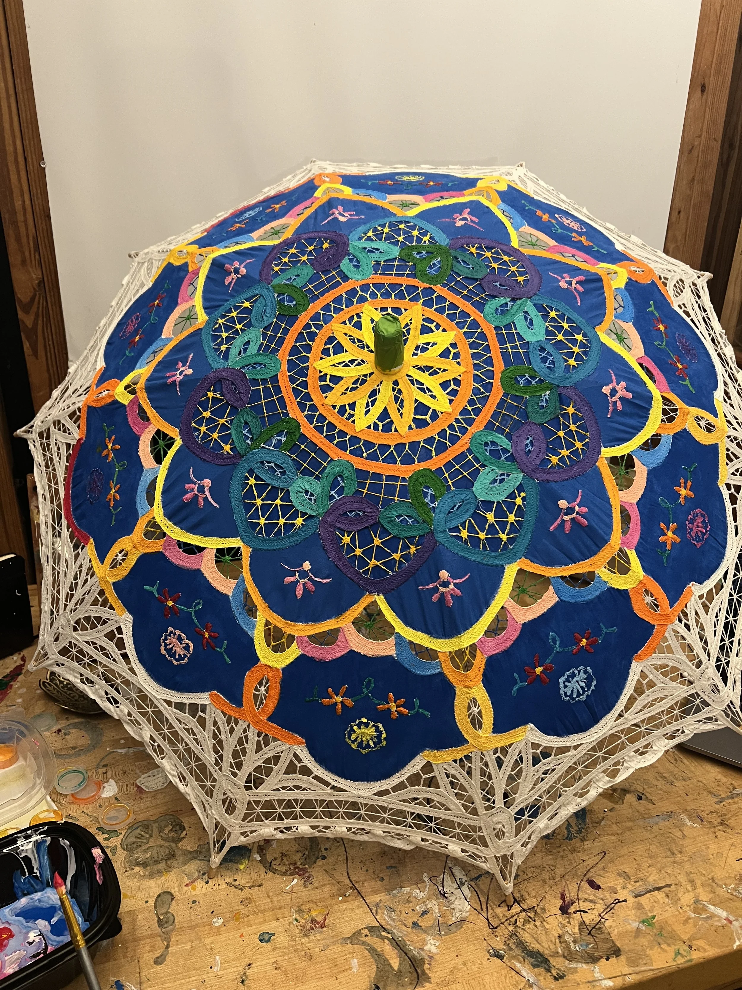 After painting the inside, underneath layer blue, I continue painting on the top, inner sphere, working my way to the outer tips of the umbrella, choosing and using one color at a time, selecting each color intuitively upon the completion of the segment before. The umbrella unfolded before me, without any predetermined plan of how the work would look in the end.