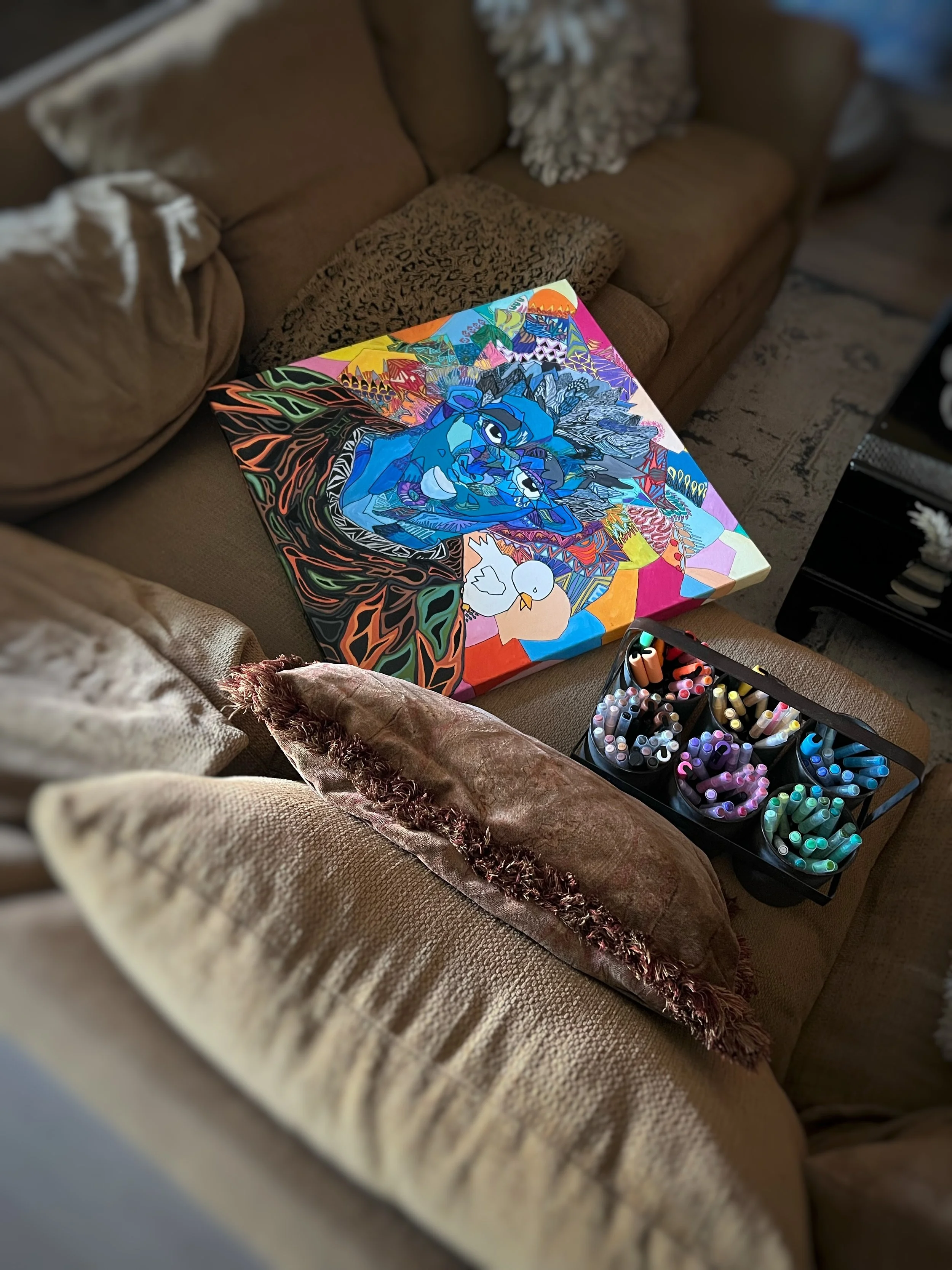 I’ve been creating new work on canvas, with acrylic, but with acrylic paint markers.